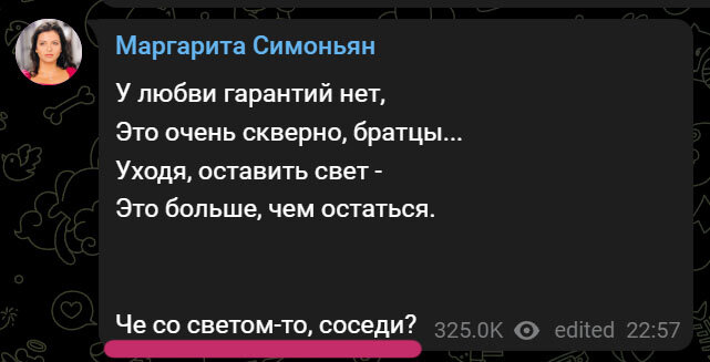 Более суток собирался духом, чтобы написать этот пост. Речь пойдет о потере всего человеческого частью моих соотечественников, которые подобно Маргарите Симоньян радуются тому, что граждане одного соседнего "квазигосударства" останутся без света и тепла: Лично мне кажется, что ...