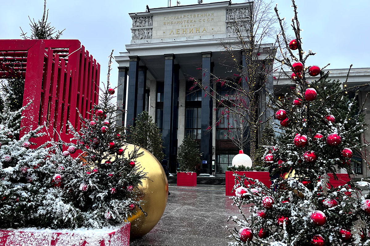 Площадка перед Российской государственной библиотекой (бывшей Библиотекой им. Ленина) в этом году украшена с особой выдумкой и с учетом специфики места. Она превратилась в новогодний читальный зал... Прежде перед библиотекой традиционно ставили большую елку. Красивую, но стандартную. ...