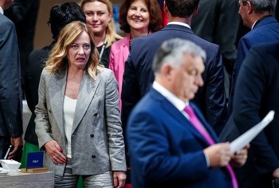 Премьер-министр Италии Джорджа Мелони во время саммита НАТО в США смотрит на премьер-министра Венгрии Виктора Орбана... ...